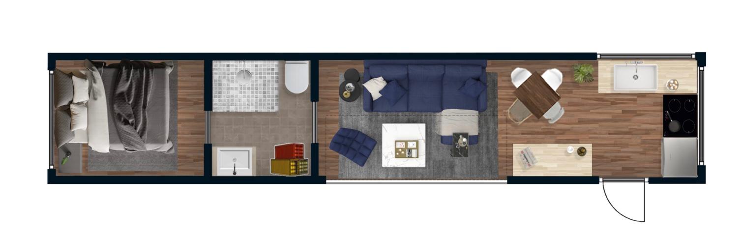 Casa Contenedor de 40 pies con tres puertas frontales, pensada para quienes buscan diseño moderno, amplitud visual y resistencia estructural en una misma unidad. Su distribución eficiente y acabados de alta gama la hacen perfecta como vivienda principal, oficina de alto tráfico, tienda móvil o espacio recreativo.