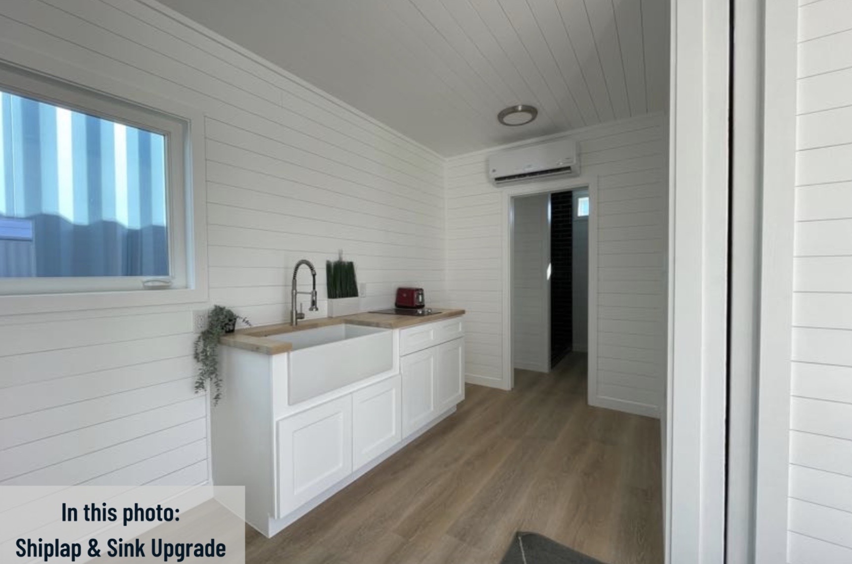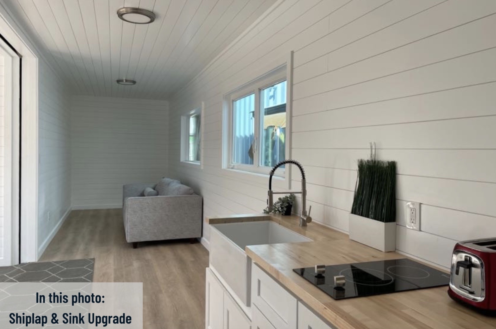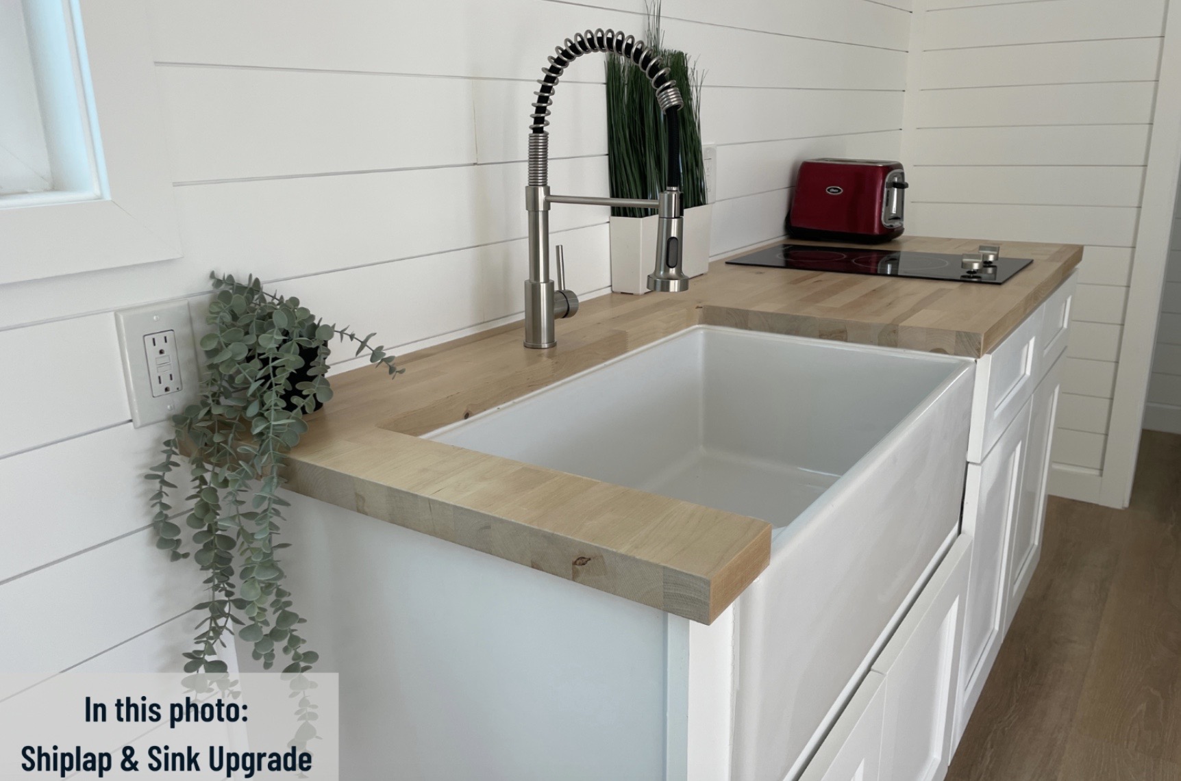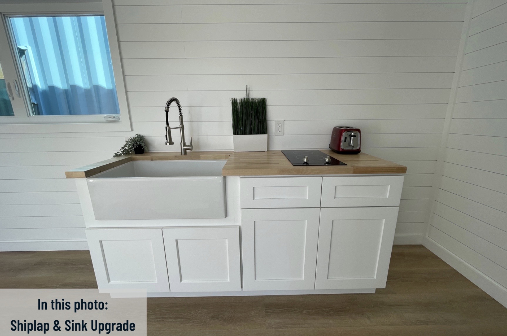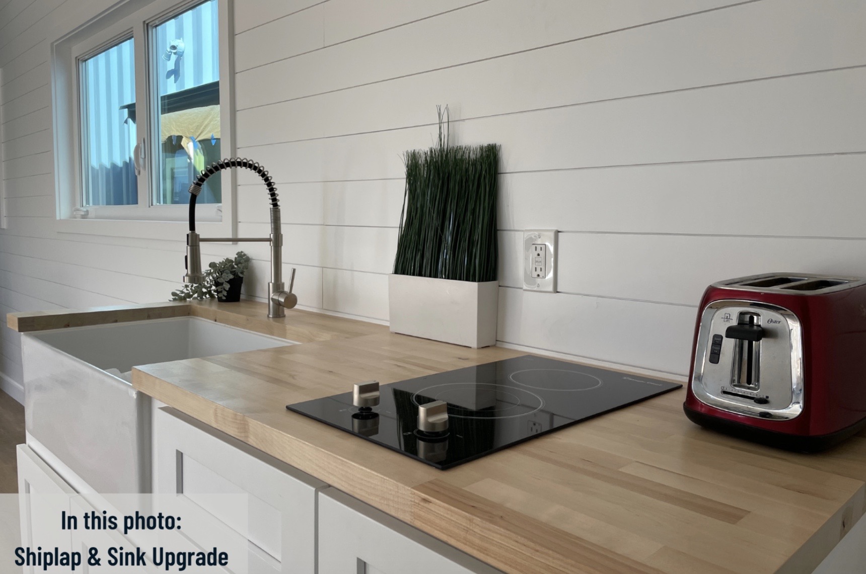 • Gabinetes estilo shaker de 6 pies con tope en madera sellada tipo butcher block