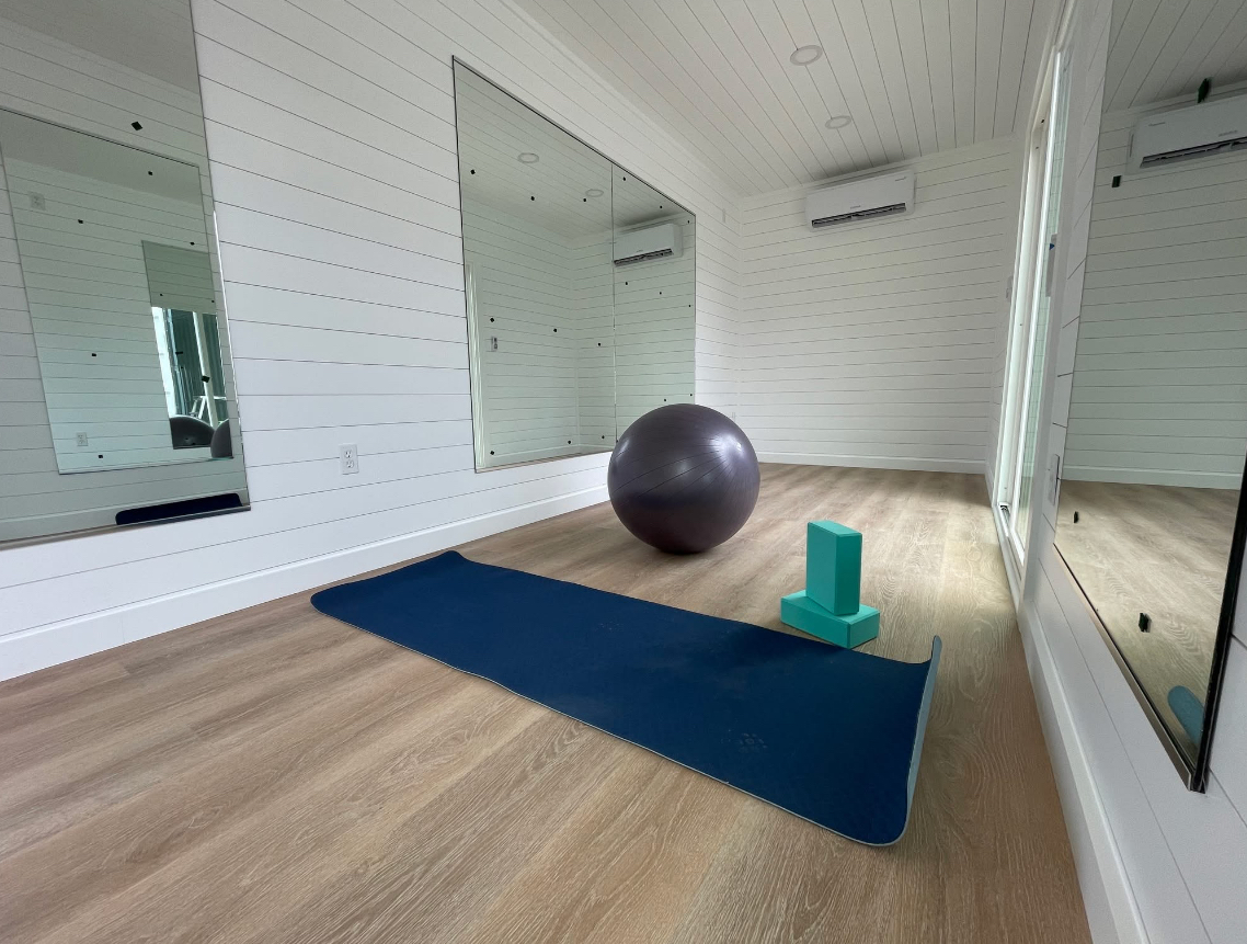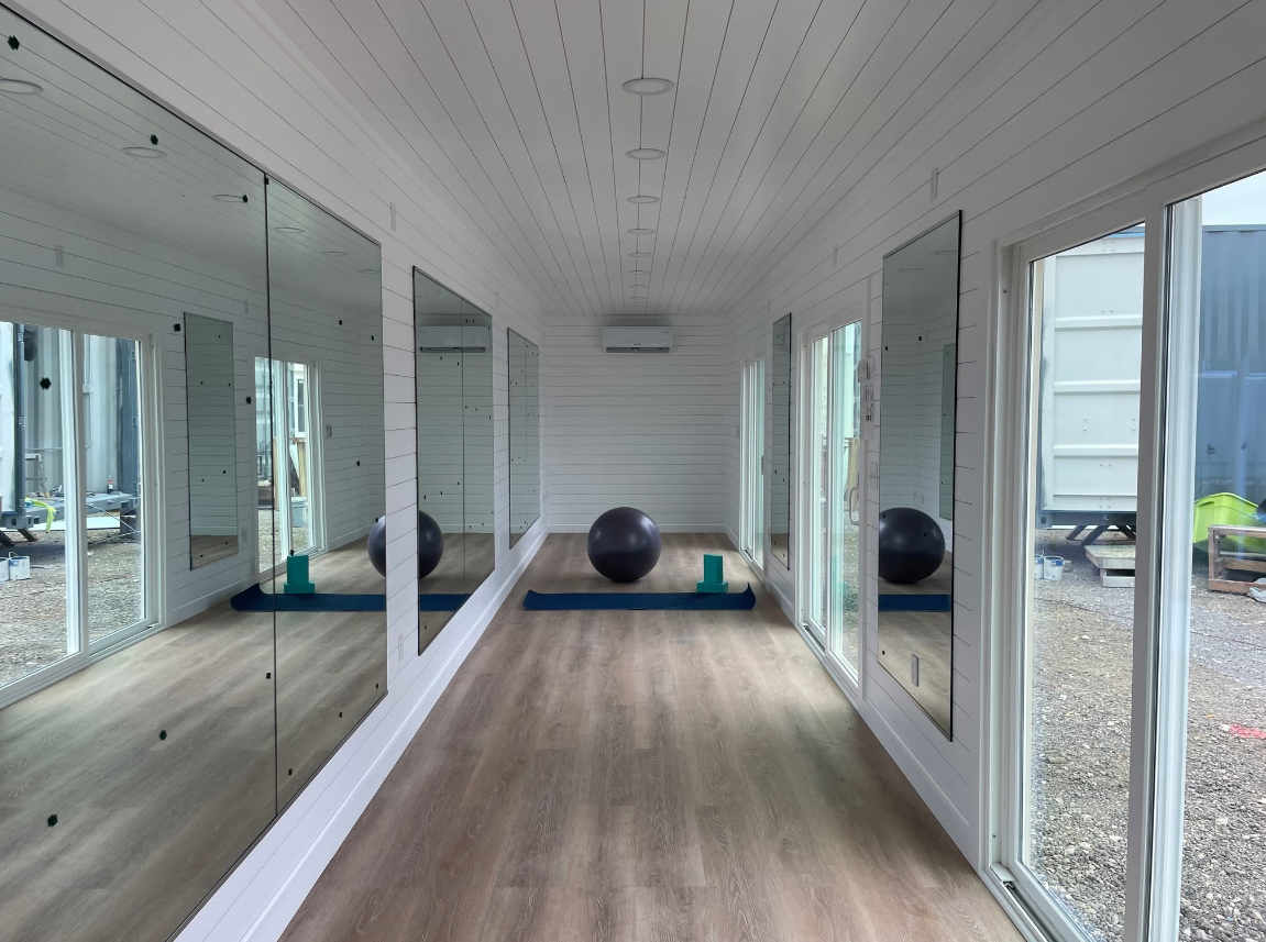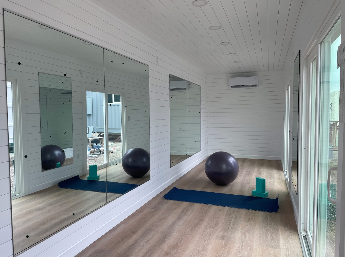 amplios ventanales, múltiples espejos de cuerpo completo y una terraza superior ideal para yoga, relajación o actividades al aire libre.